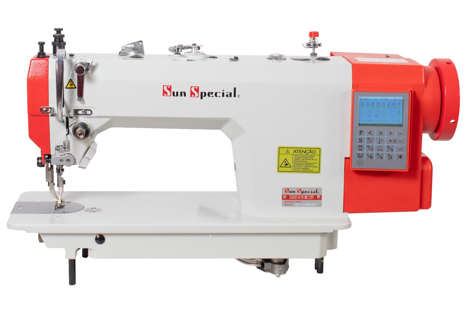 Máquina de costura reta industrial Sun Special de transporte duplo SS0303E-D4-PR-HMC (dente e calcador alternante) base plana com motor Direct Drive ideal para tecidos grossos. Além disso diversas programações automáticas como arremate inicial e final, corte de linha, costura programada, levantador do calcador, parada de agulha e lubrificação automática.